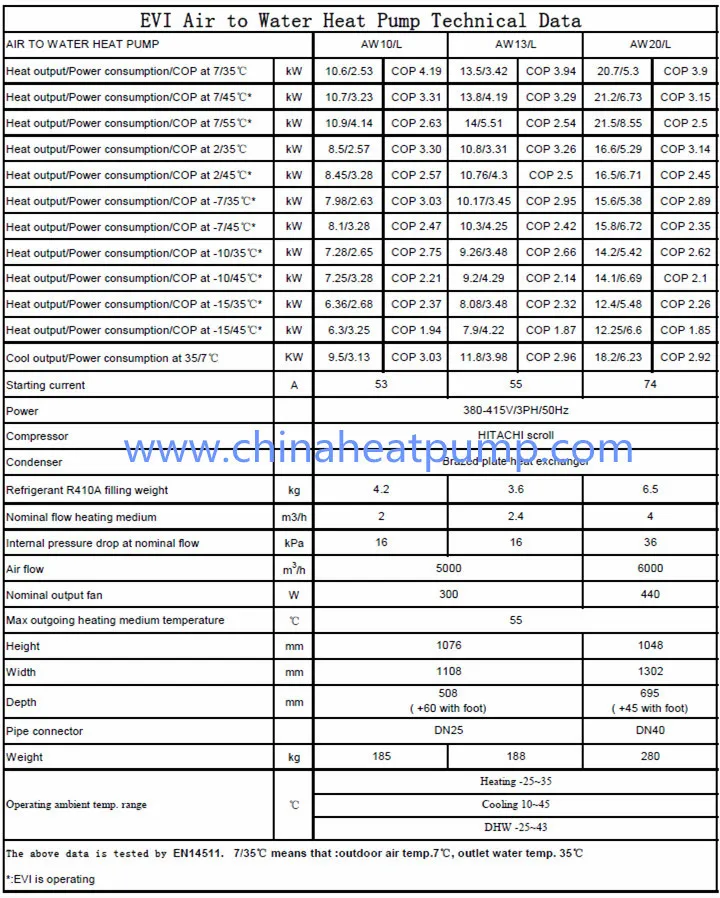 13kw evi monoblock air source heat pump manufacturer technical data: